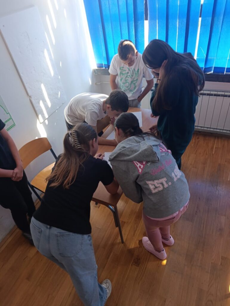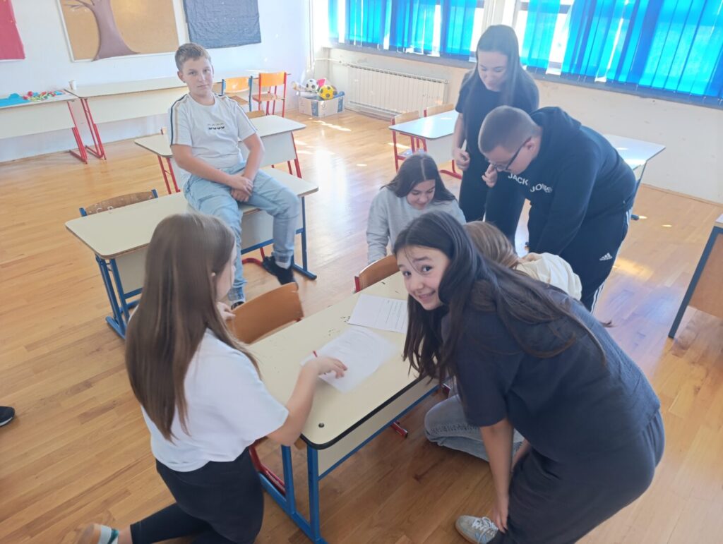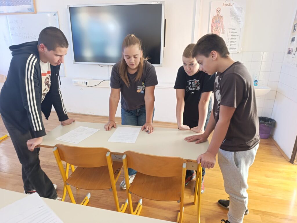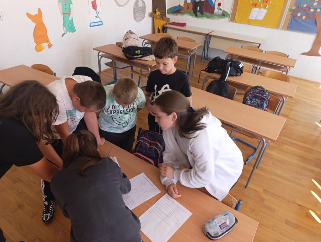 Dana, 29.9.2024. godine, u našoj školi obilježili smo Europski dan jezika. Učitelji hrvatskog, engleskog i njemačkog jezika: Ivana Grabić, Marina Štambuk Poparić i Markiša Visković, osmislili su zanimljivu aktivnost Scavenger hunt tj. igru potrage za skrivenim predmetima. Učenici su prvo imali zadatak riješiti razne jezične mozgalice, zagonetke, rebuse i premetaljke u tri skupine pitanja te pokazati znanje iz hrvatskog, engleskog i njemačkog jezika. Rješenja su ih vodila do predmeta skrivenih u prostoru oko škole poput školskog vrta, školskog igrališta, itd. Sudjelovali su svi učenici od petog do osmog razreda pomiješani u četiri skupine.