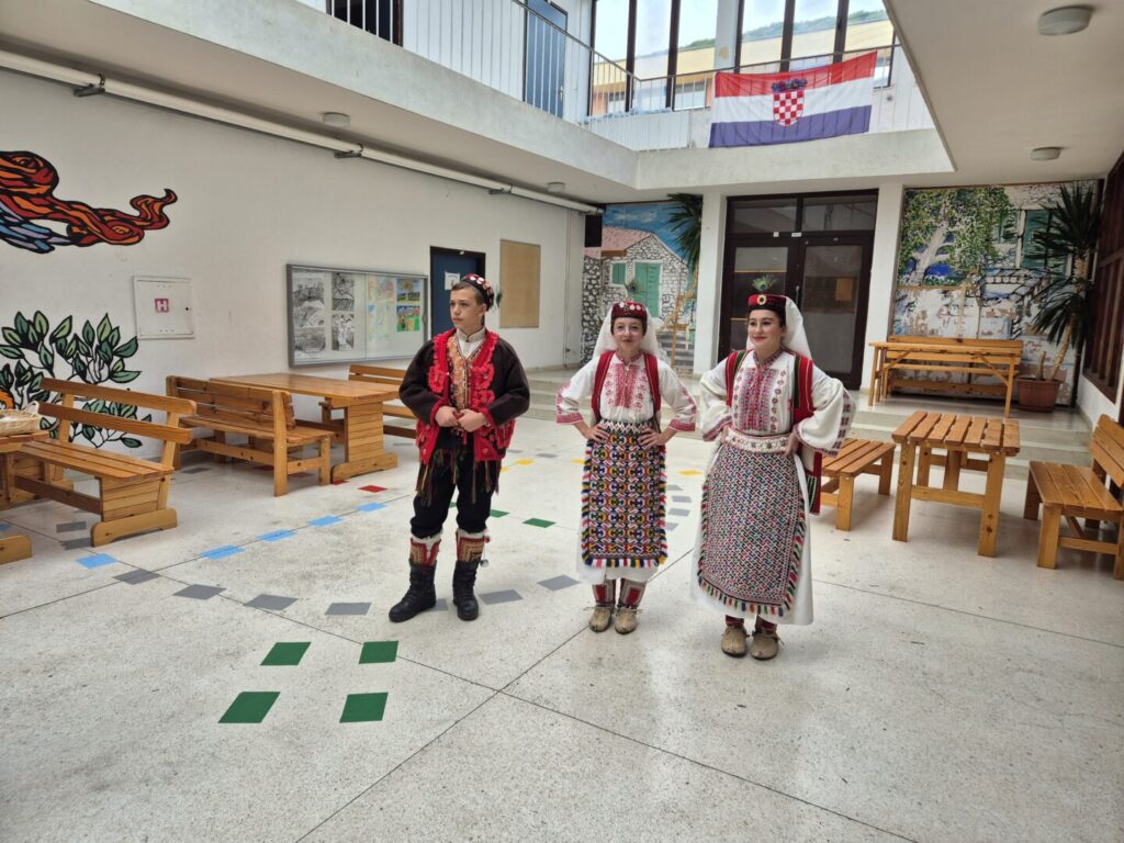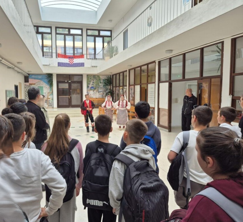 Dana 22.10.2025.g. učenici Osnovne škole Dinka Šimunovića iz Hrvaca i područne škole u Potravlju su posjetili našu školu, u sklopu svoje terenske nastave kojom su obišli vrlički kraj i izvor rijeke Cetine. Učenici su u školu došli u pratnji učiteljice Mirene Buljan-Bašić i učitelja Stjepana Pereže. Naši učenici i djelatnici su ih srdačno dočekali. Posebnu pozornost našim gostima su iskazali učenici Marta Kaselj, Gabriel Milković i Antea Boduljak koji su ih dočekali u vrličkim nošnjama i iznenadili ih kratkom izvedbom nijemog kola. Naši učenici su predstavili vrličku nošnju, pokazali posjetiteljima zavičajnu zbirku u atriju škole, predstavili UZ Zvrk i njihove proizvode te učenike ugostili u našoj knjižnici. Učenica Marta Kaselj je u knjižnici prikazala prezentaciju o vrličkom kraju, običajima i našoj školi. Gosti su nakon male pauze u knjižnici prošetali do našeg vrta (vanjske učionice) te su se puni pozitivnih dojmova o našoj školi zaputili prema Česmi.